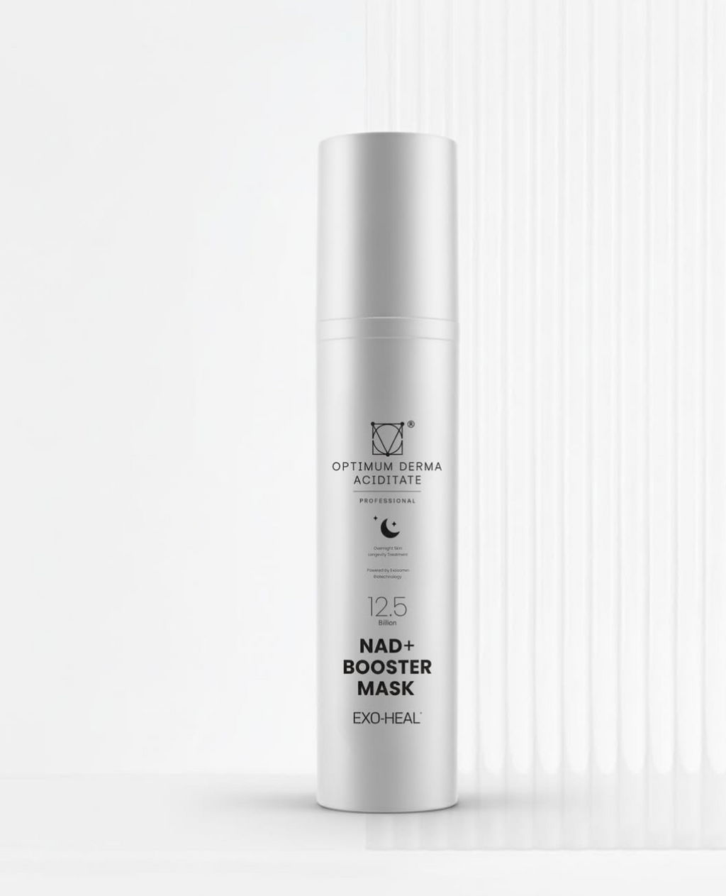 OPTIMUM DERMA ACEDITATE NAD⁺ Booster Mask with Exosomes on edistynyt yön yli tapahtuva hNAD⁺-tehosteaineilla ja maidosta peräisin olevilla eksosomeilla kehitetty naamio tukee ihon uudistumista, parantaa kimmoisuutta ja jättää ihon tuntumaan sileämmältä, kiinteämmältä ja syvästi kosteutetulta aamuun mennessä.